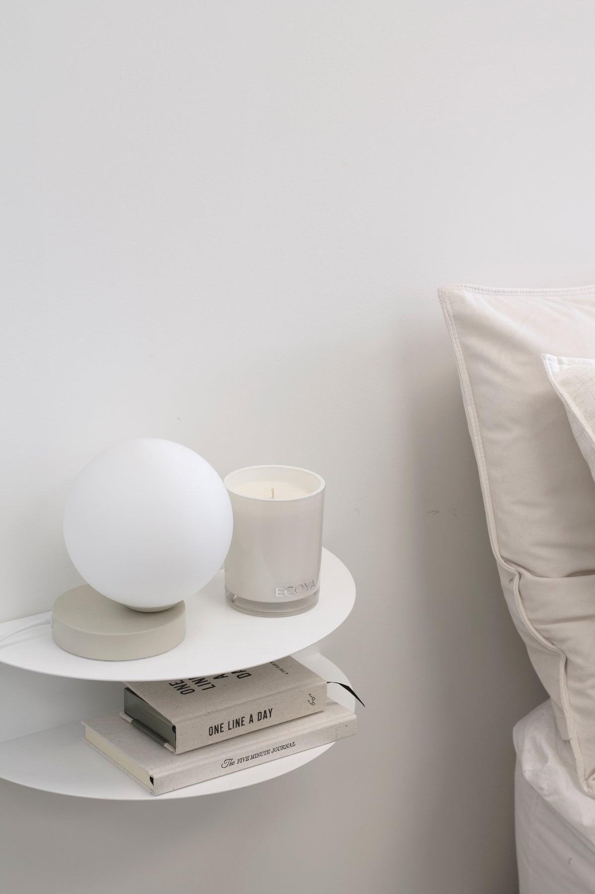 Made of Tomorrow FOLD Bedside Table – Minimalist Wall Shelf in White or Black – a floating bedside perch for book, phone, glasses and a glass of water; perfect in smaller rooms, bach bunkrooms, or as “his” side next to a bigger bed.