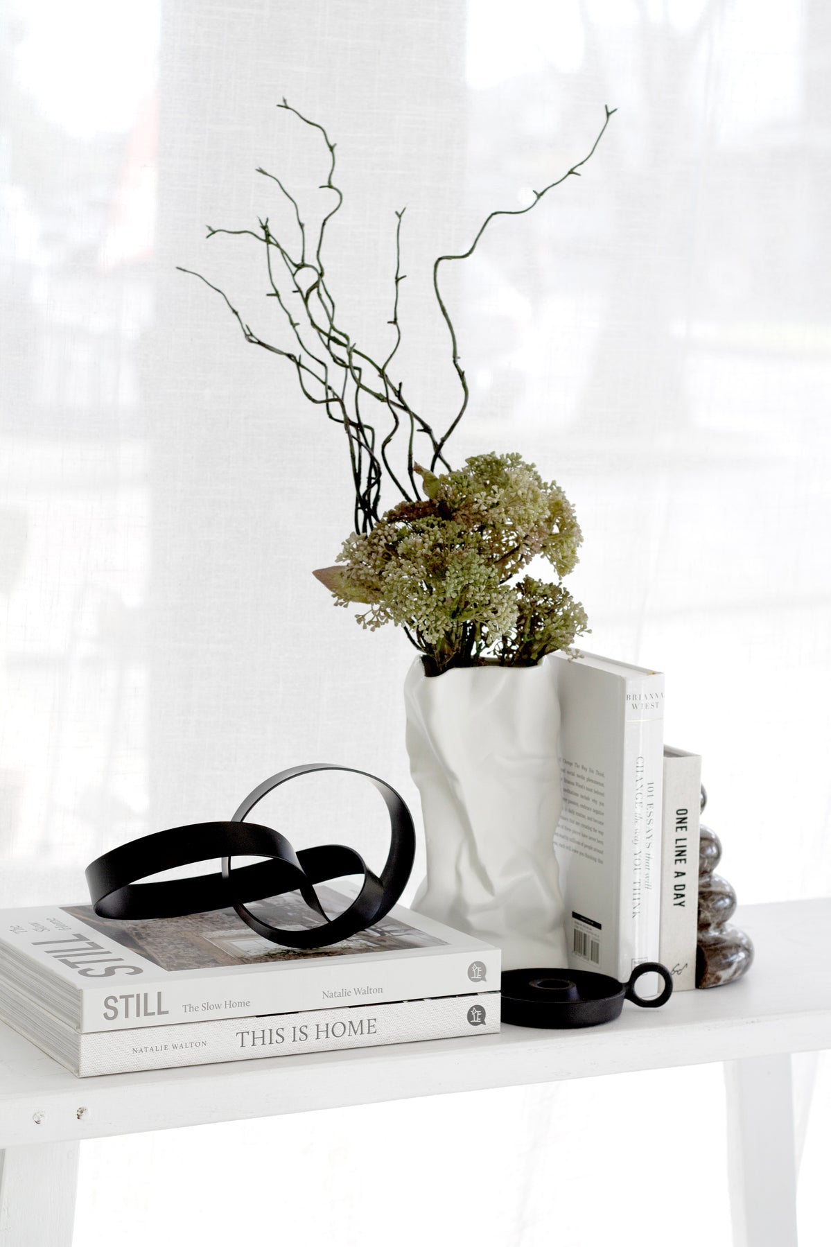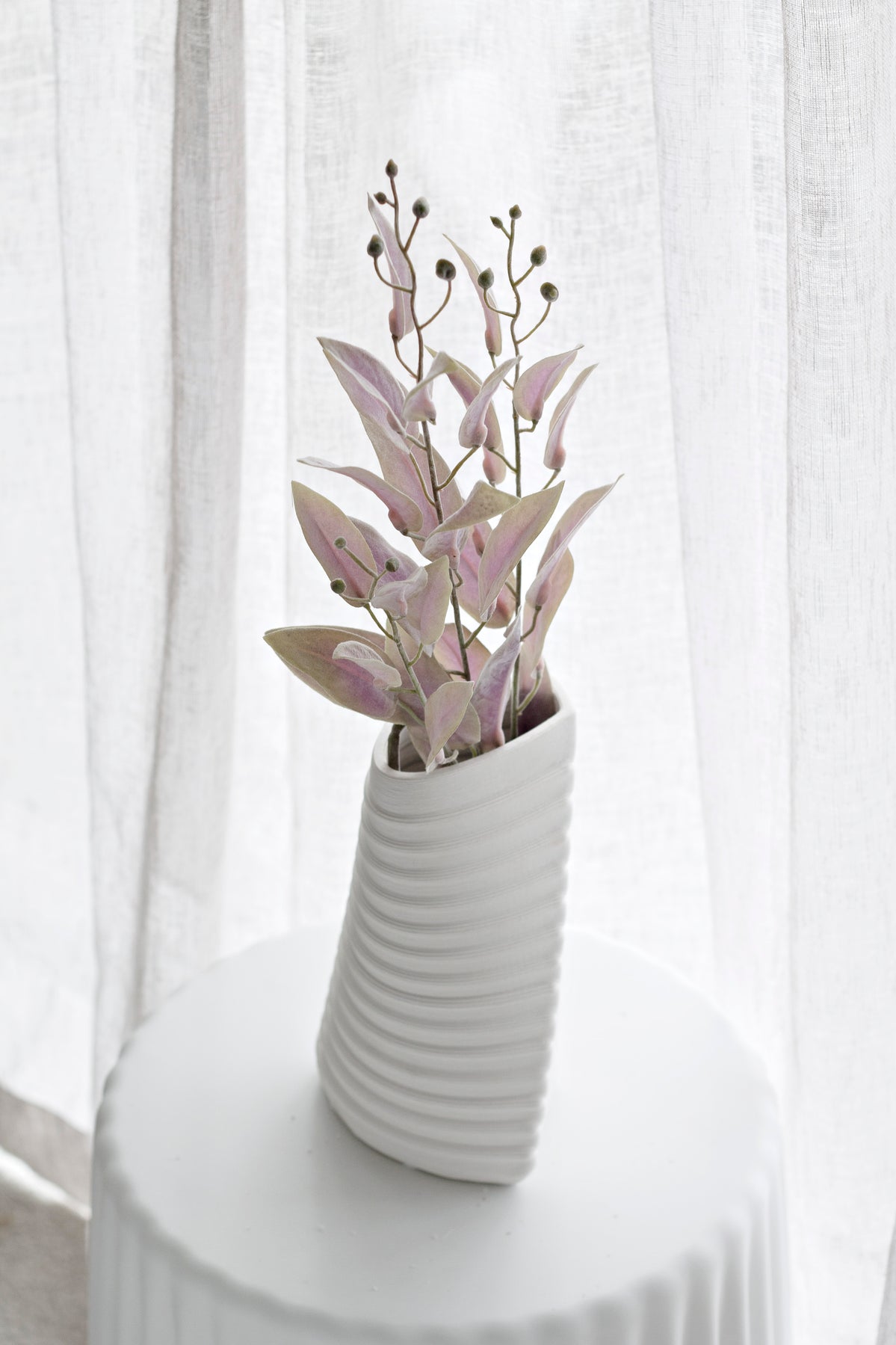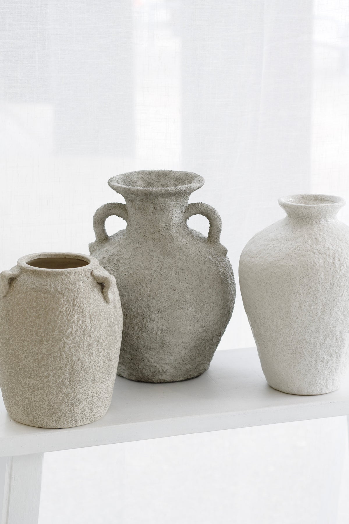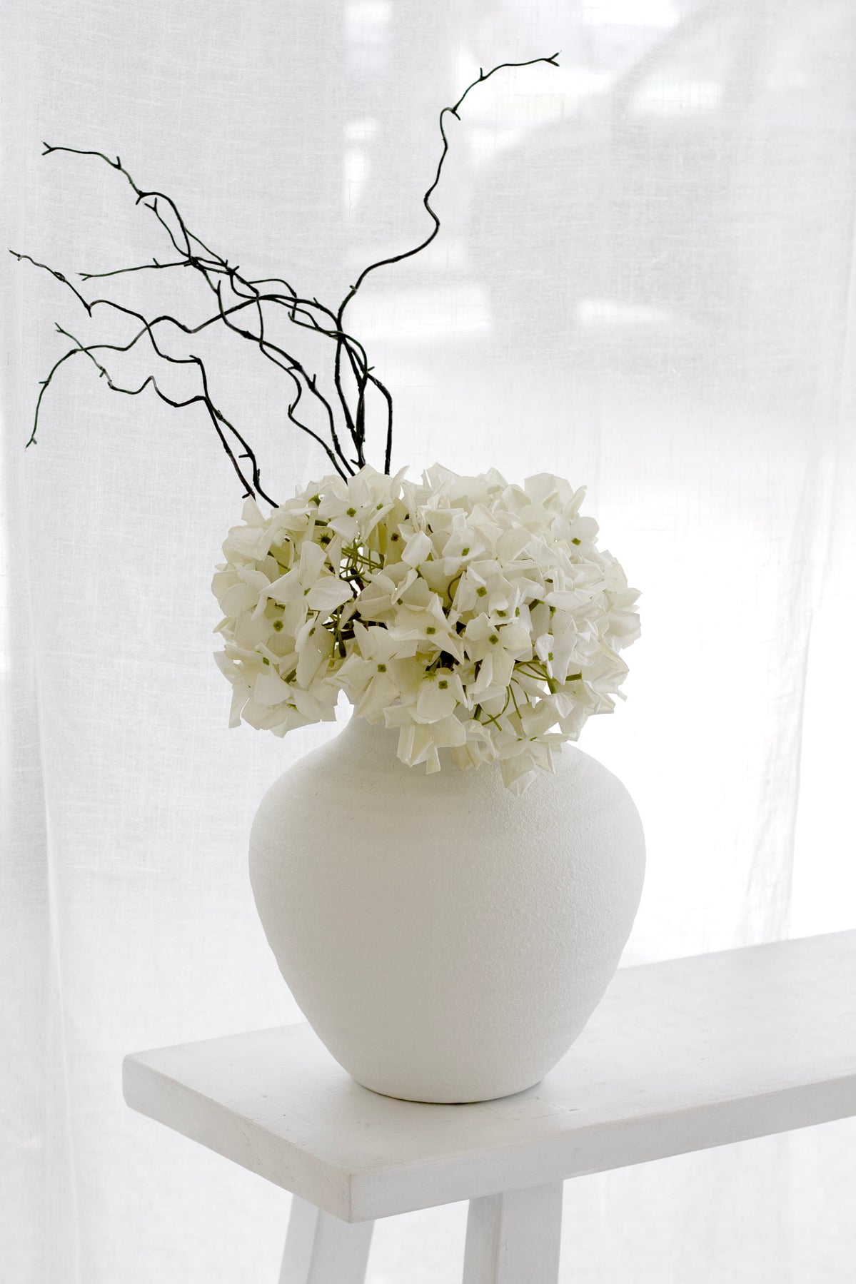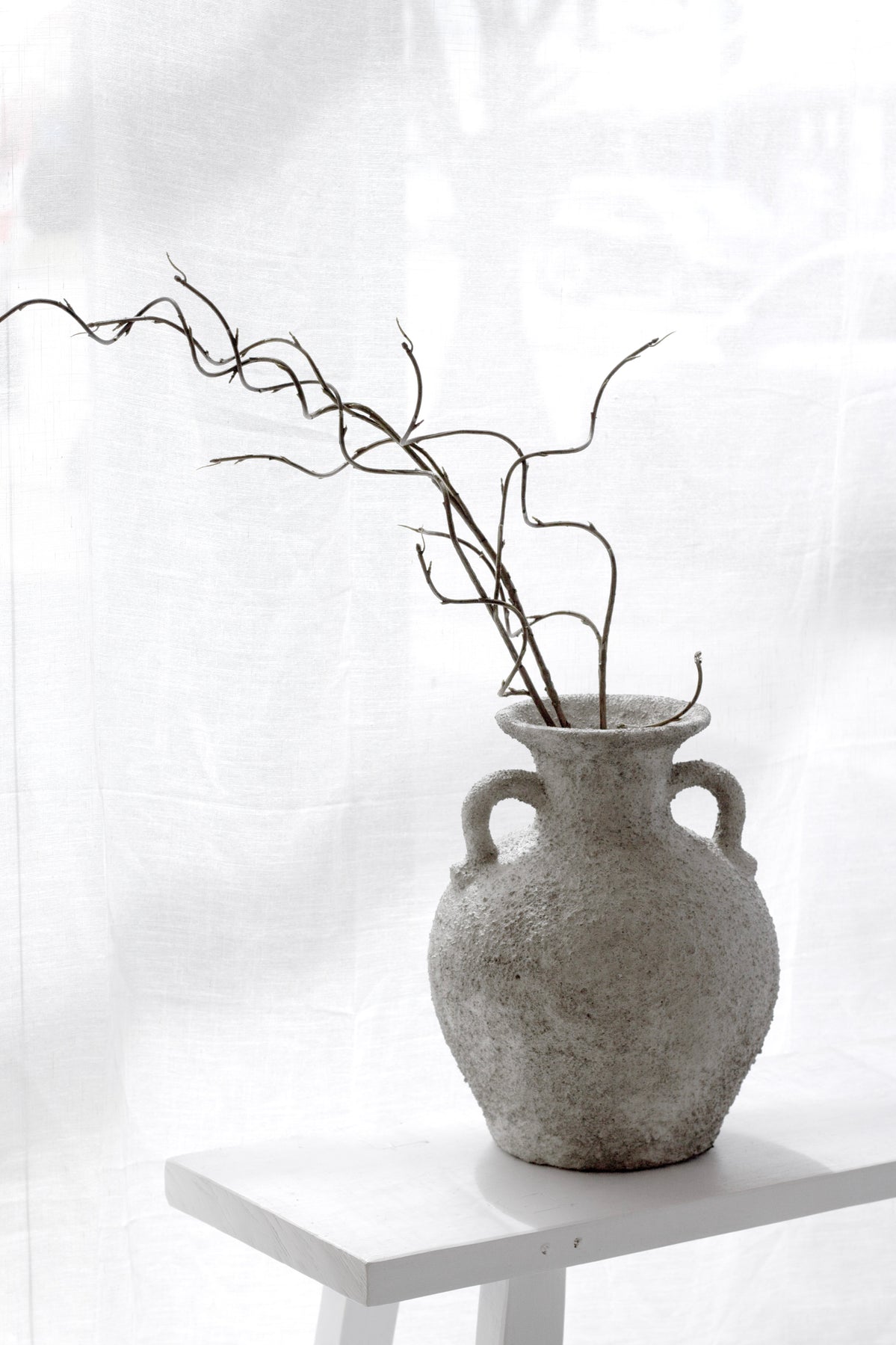 Thira Stone Vase, Textured Vessel: striking with white stems like Hawthorn Blossom or a full cluster of Pompom stems.