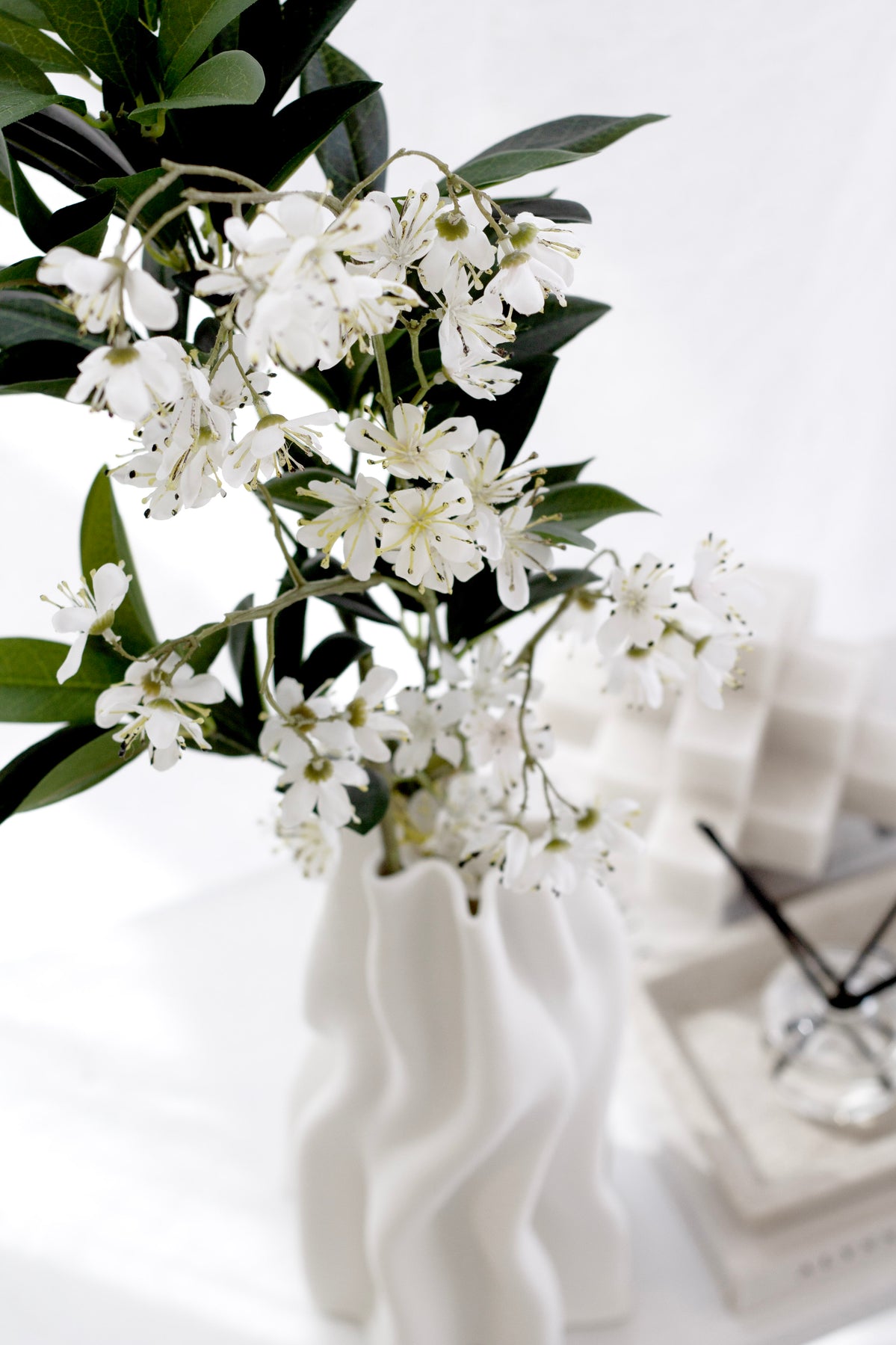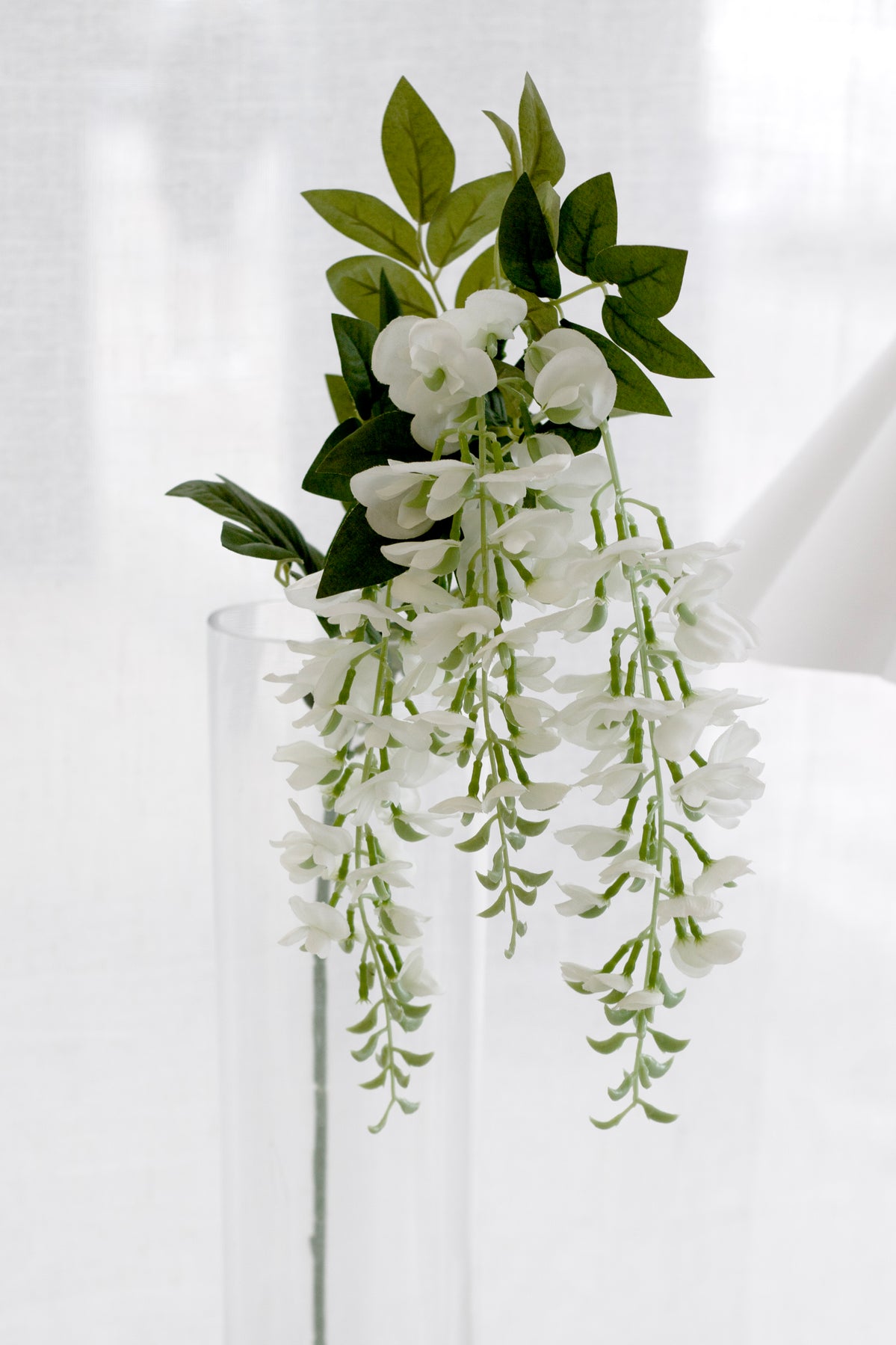 White Wisteria Spray, 92cm Cascading Faux Floral Stem: cascading white blooms that add movement to tall vases or shelf edges.