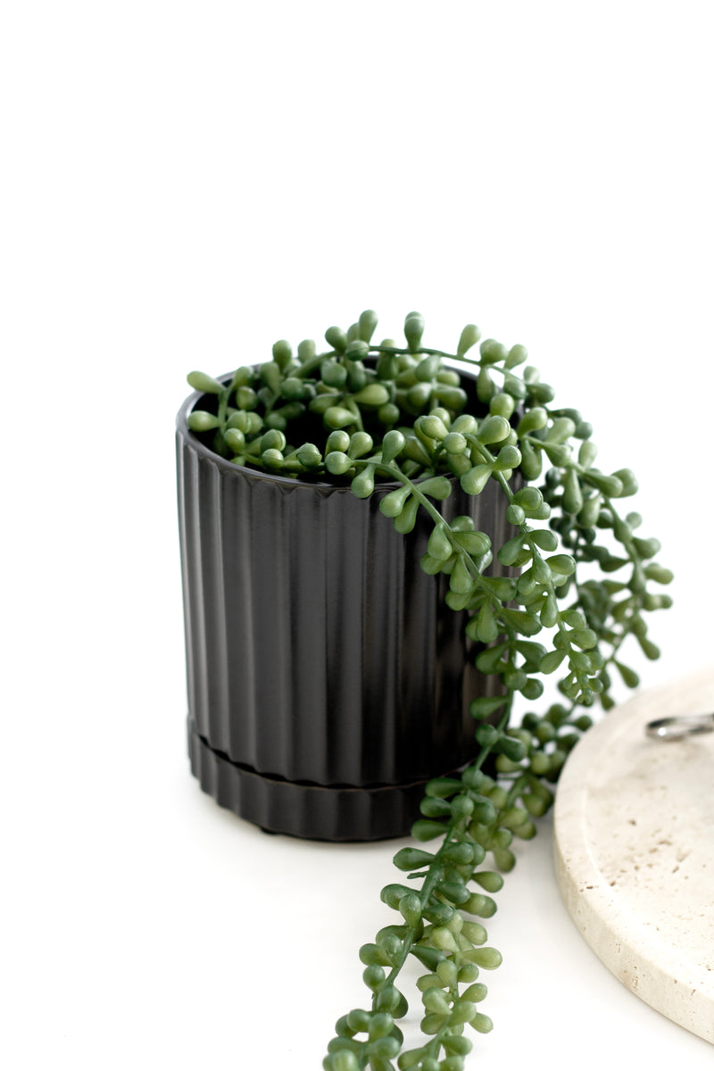 Bring timeless elegance to your home with the Athens Planter in Black — a ribbed ceramic pot designed with both style and function in mind. Finished in matte black stoneware, this planter includes a drainage hole and matching saucer, ensuring your plants thrive while keeping surfaces clean.